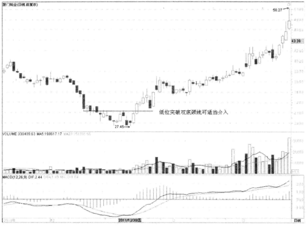 如图3-7所示,厦门钨业前期大幅下跌,在相对低位二次探底,然后持续上涨,股价突破双底颈线,短线投资者可以积极跟进。进场的时机一定要紧盯股价是否有效突破双底的颈线。只有突破颈线,才能确认底部形成,表明后市进入上升趋势中。
