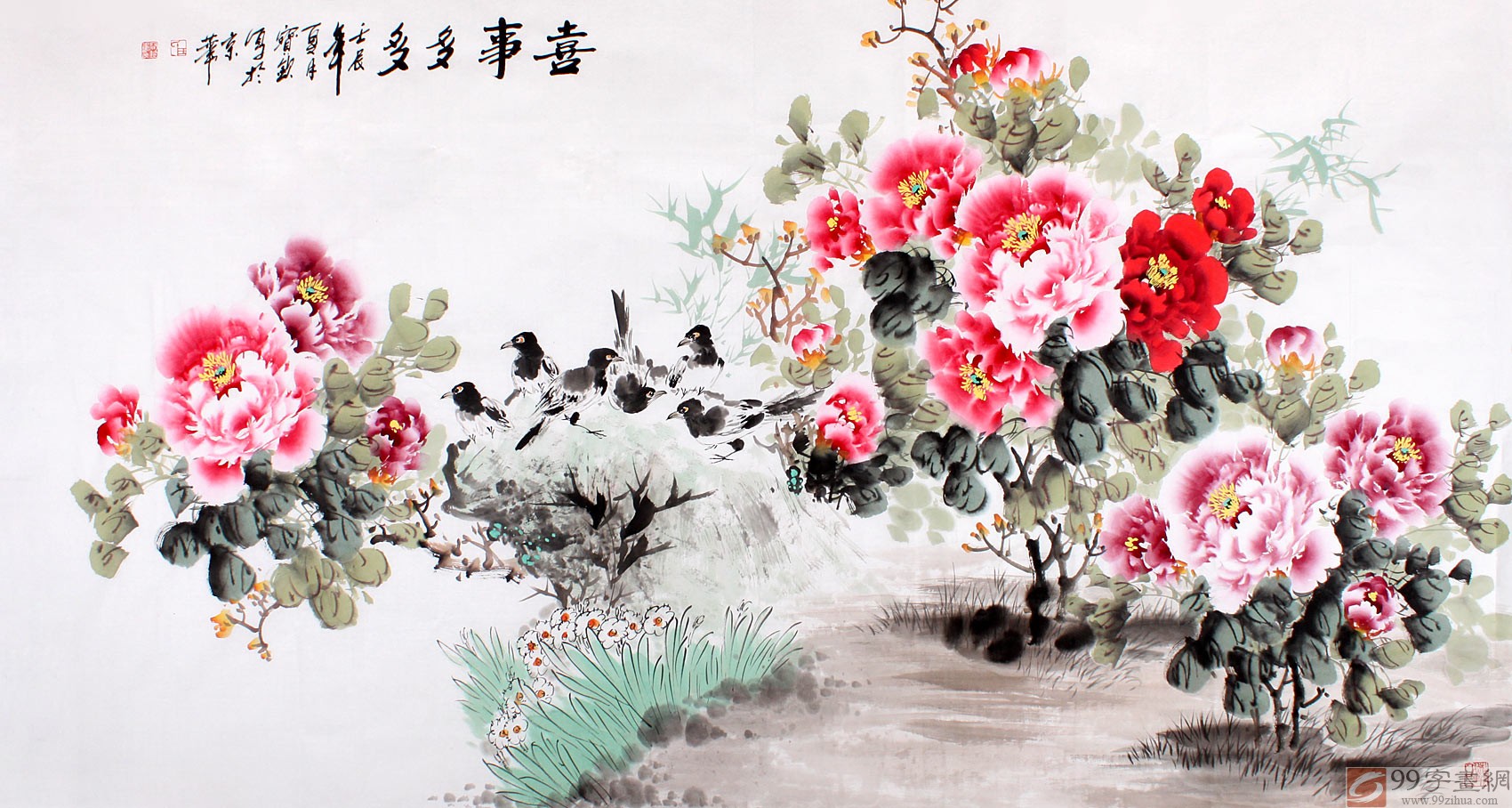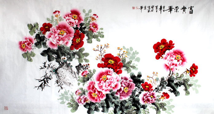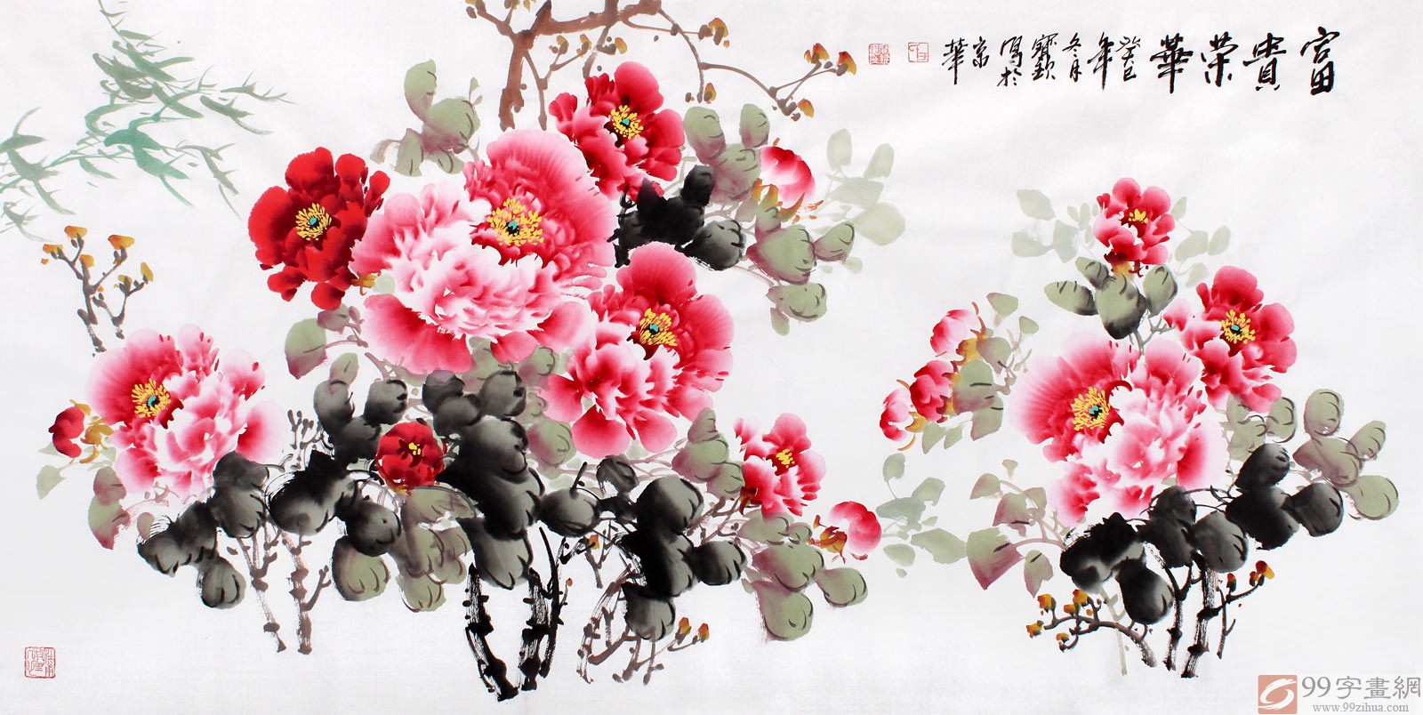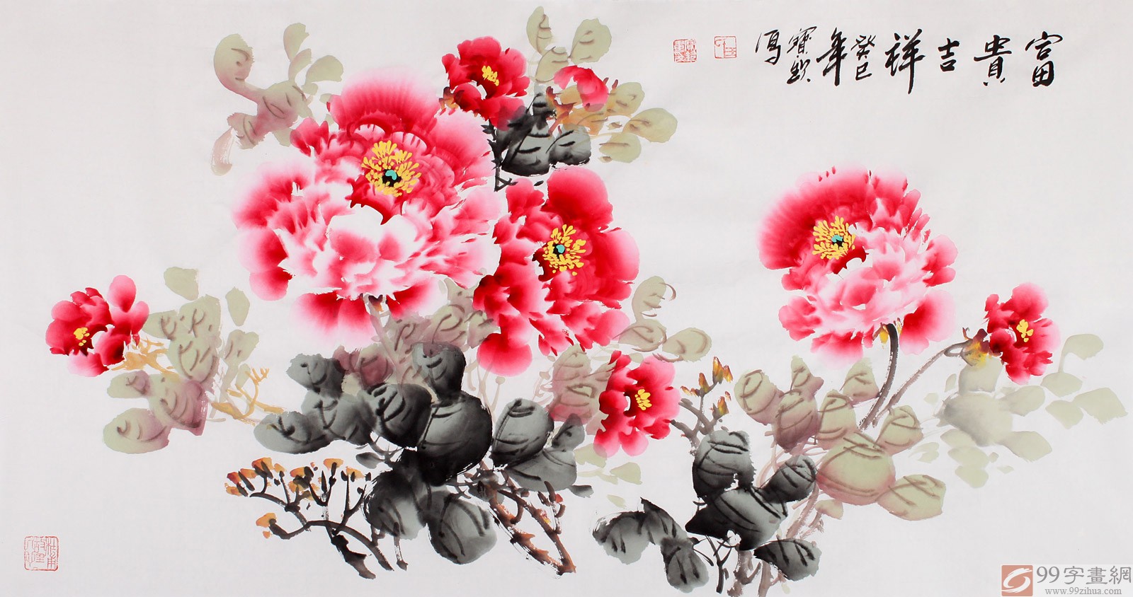 4.一幅画中出现的花头,其姿势、大小、色彩、明度、走势不能雷同,要有变化,才符合牡丹的生长结构,同一色系的花头颜色也要有浓淡之分,以变化增加画面的立体感;
