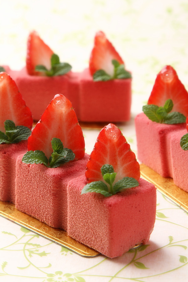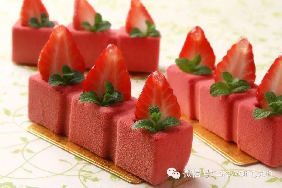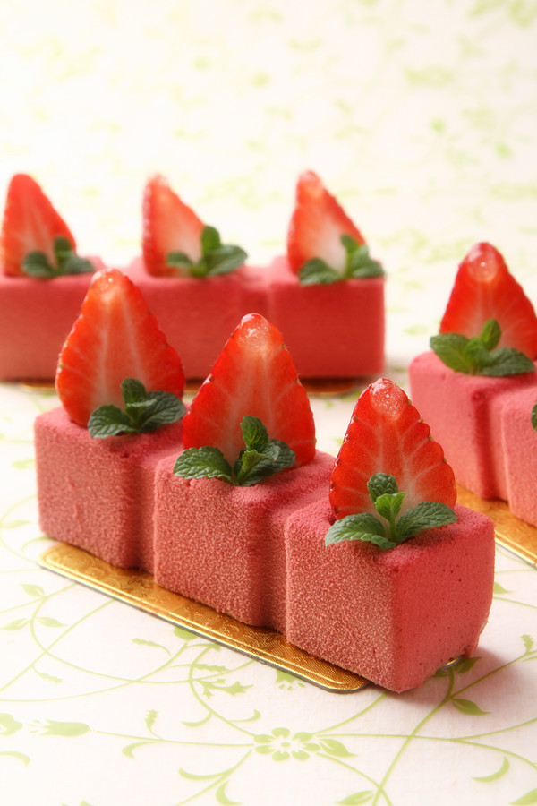 4:可可脂装入巧克力喷枪中,喷在慕斯表面,装饰上水果即可完成。