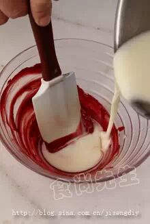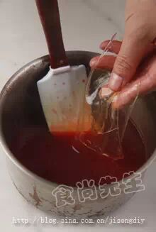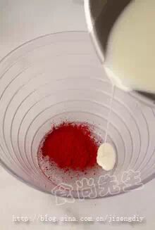 2:红色色粉放在碗中,少量的放入融化好的可可脂搅拌至没有粉的颗粒完全融和。