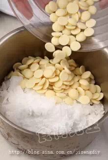 1:将白巧克力和可可脂一起隔水加热至完全融化。