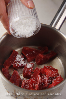 制作过程:1:将草莓果融和砂糖一起放入锅中直火加热至沸腾后停火。