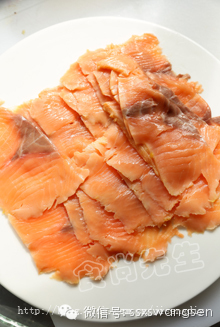 4.取出三文鱼切斜刀片片,按图片摆盘装饰即可。