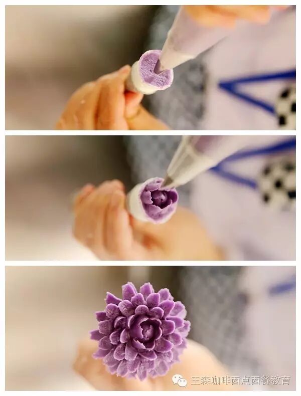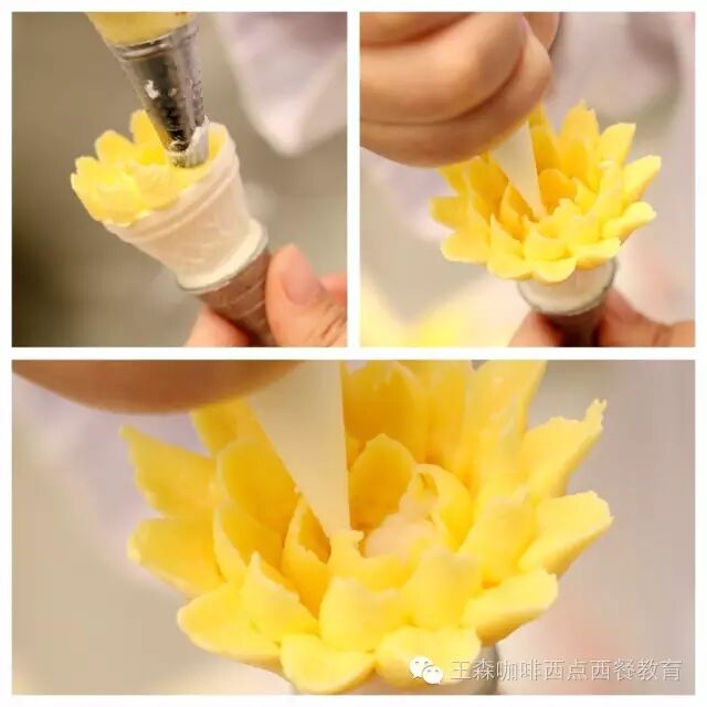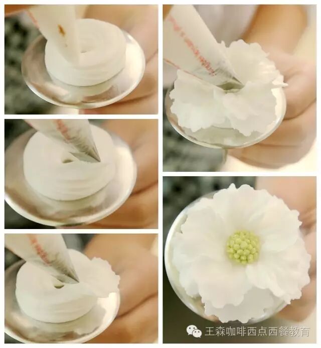 4.花瓣最后一瓣收口时,花嘴角度略翘,以免碰到另外的花瓣。做完花瓣后,在裱花袋内装入奶油,由粗至细体现花心。