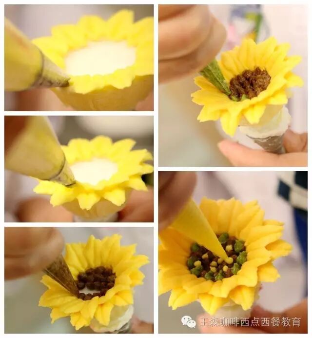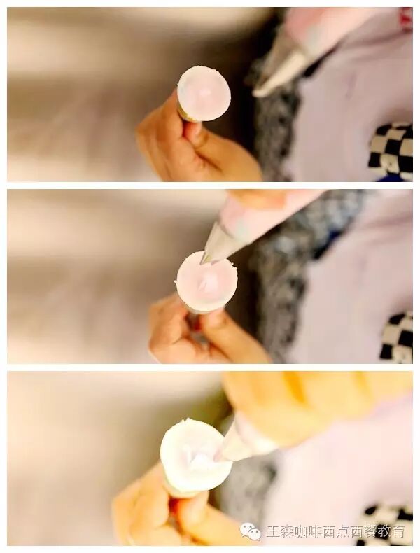 1.将花嘴薄头朝上,紧贴于花托尖部,左手将花托请转一圈,右手挤出奶油直绕一圈,作为花蕊步骤。