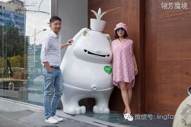 翎芳老师和承亿文旅集团的品牌长张力中在可爱的吉祥物憨吉前的合影
