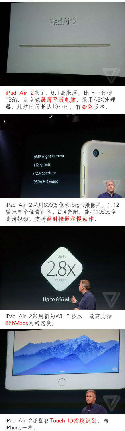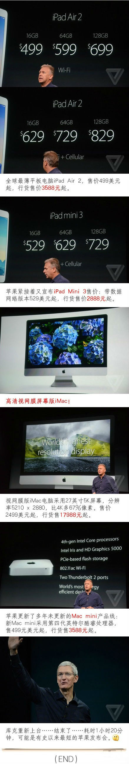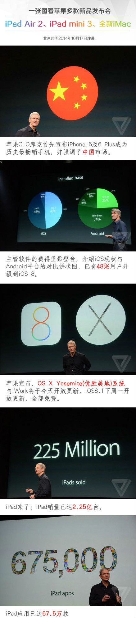 这也是继苹果iPhone 6、iPhone 6 Plus正式发布后,苹果在今年秋季举办的第二场大型发布会。在此次发布会上,苹果正式发布了iPad Air 2、iPad mini 3、视网膜屏iMac、新款Mac mini以及iOS 8.1和Yosemite系统。