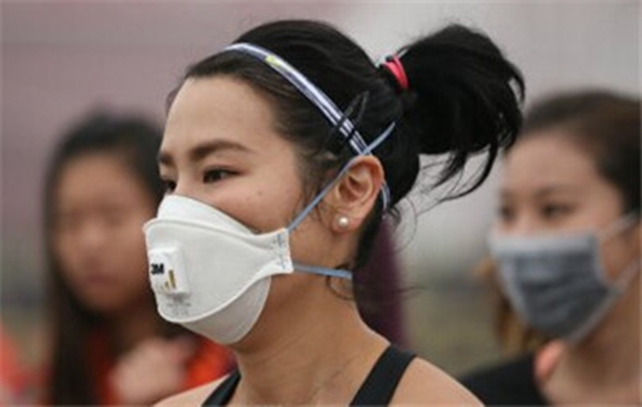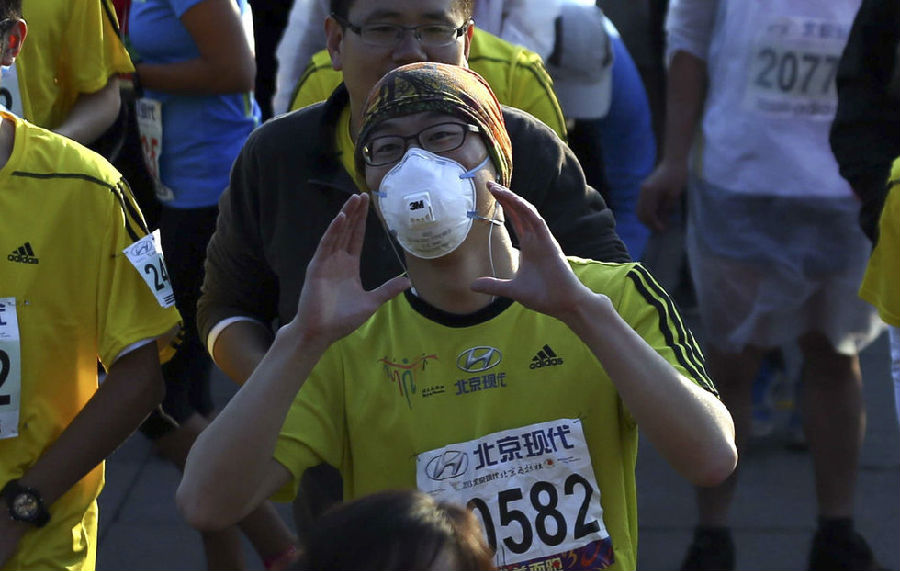 在雾霾笼罩下,很多的参赛选手都选择戴上口罩。