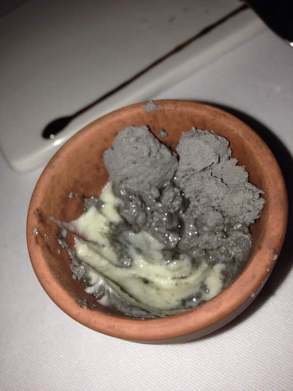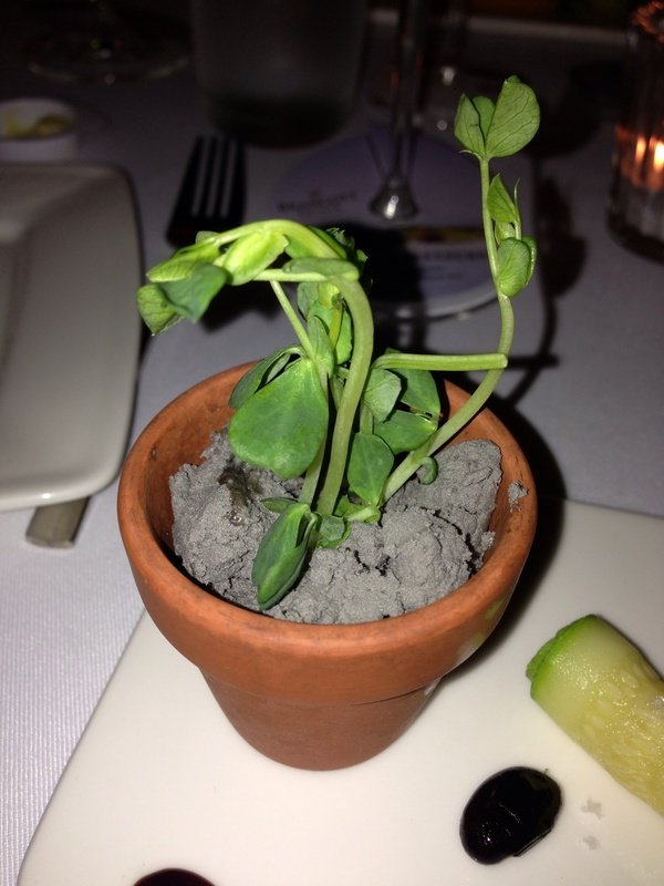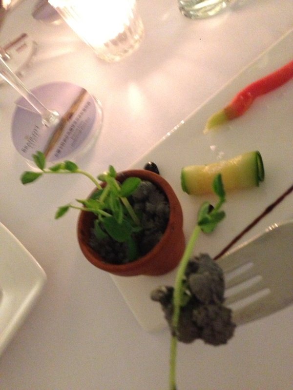 這道前菜 看上去是盆栽 其實除了 裝盆栽的食器不能食用外 看起來像是土壤的東西 真是讓人驚喜呀!! 鹹鹹甜甜的滋味 好特別