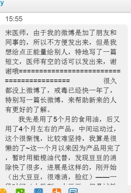 宋医师,由于我的微博是加了朋友和同事,所以不方便发出来。但是我想给点正能量给别人,特地写了一篇短文,医师有空的话可以发出来,谢谢哦。