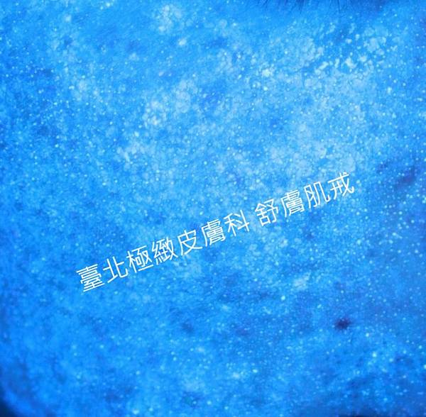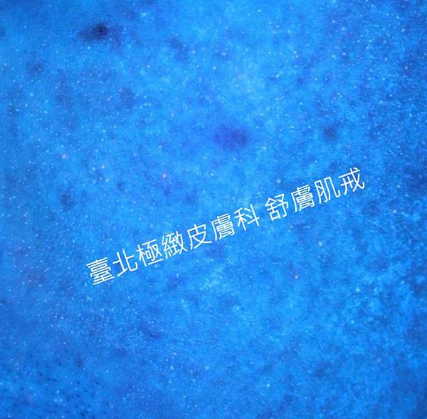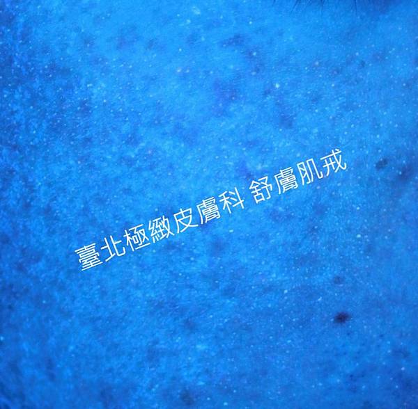 除了皮肤镜的50倍放大证据;伍氏灯(Wood’s light)也可以显示出舒肤肌戒前后的老废角质乳化情形: