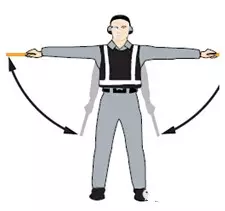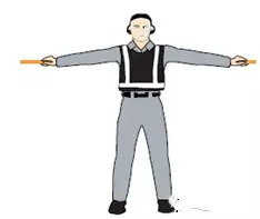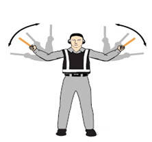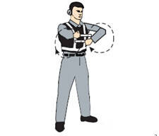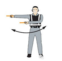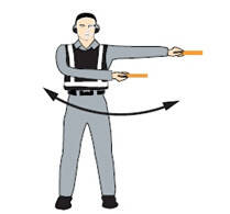 一臂水平指向右侧,另一臂反复向所指方向挥动,示意直升机应向左移动(转向) |