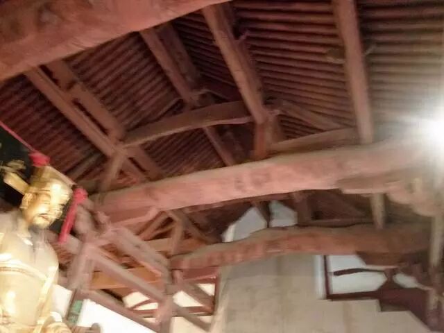 走进正殿来,屋内的梁架采用六椽付,彻上露明造(也就是没有天花板的意思,可以直接看到屋顶的椽子),不仅用材敦实而且简洁轻巧,可以看出是利用原始木料的自然弯曲进行的微微砍削处理,这是较为典型的元代工匠工艺和手法。