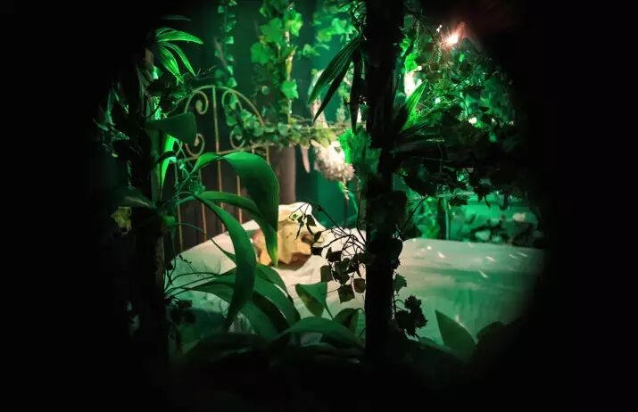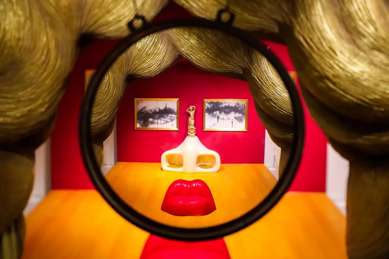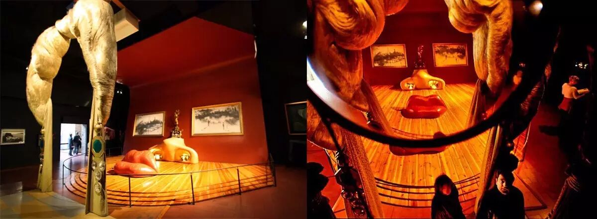 在这间称作梅•蕙斯特的房间中,达利使用特定元素(嘴唇形状的沙发、雕塑、画作和窗帘等)代表她的嘴唇、鼻子、眼睛和头发,乍一看,它们都是独立的部件。然而当我走上几级楼梯,站在一个树立着恐龙雕塑的平台上,从这个特定的方位观察,映入眼帘的则是梅•蕙斯特完整的正脸。