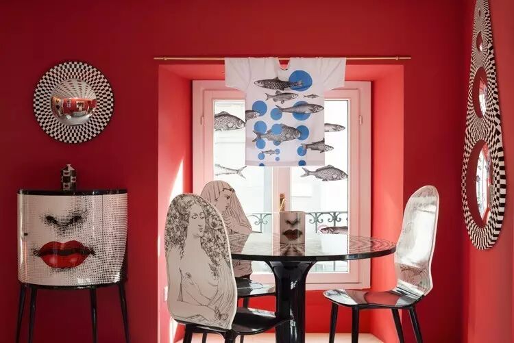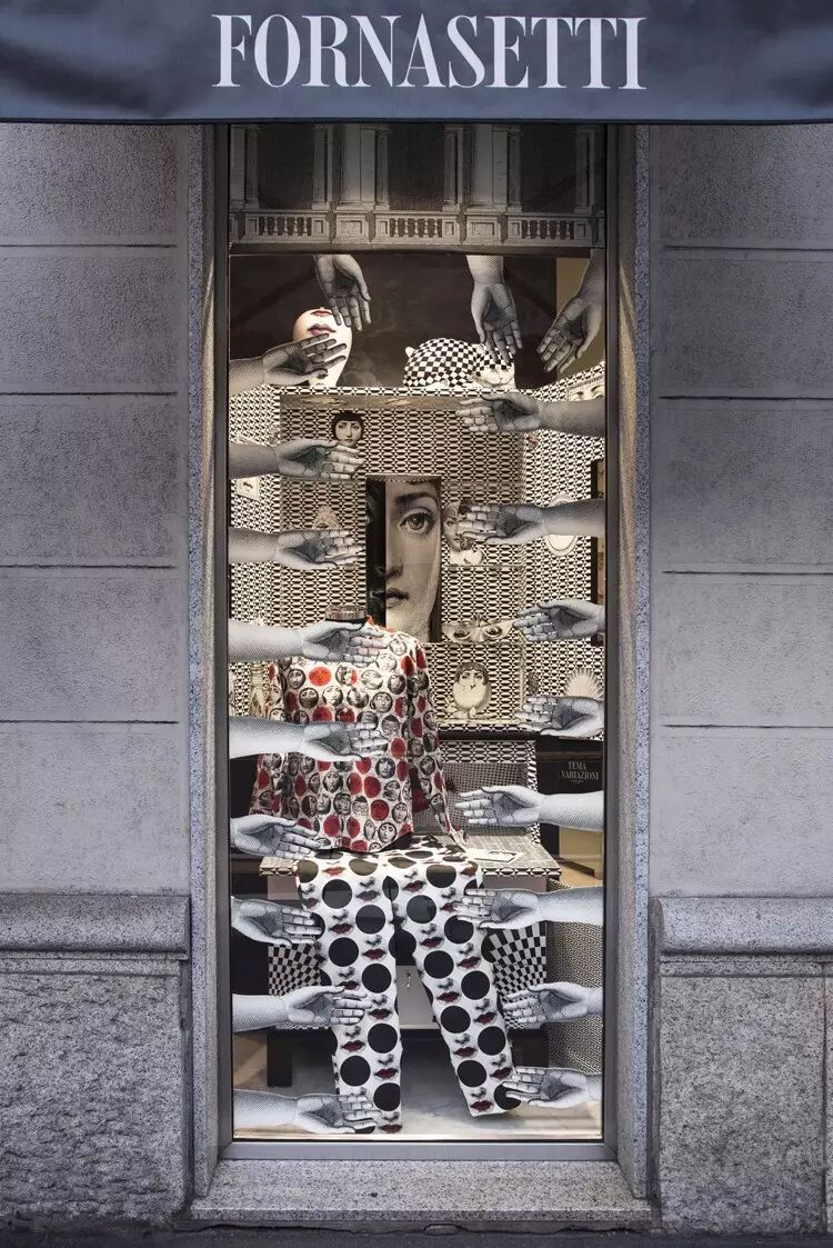 这一系列的印花西服套装,这些套装是与意大利家居品牌Fornasetti合作设计的,带有图案装饰的西服套装上是富有他们特色的蚀刻面孔,嘴巴和眼睛。
