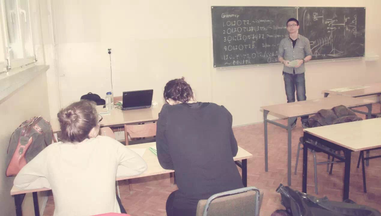 江浩然负责的是日语的教学,听课者有大学的在校学生,也有当地的日资企业员工。面对这样一群10人以内、日语零基础、典型的活泼幽默的波兰学生,我在想对于他这样一个专业出身的研二学生而言,面对这样的课堂,会不会就跟大学校园里经常做的 presentation 一样轻松?