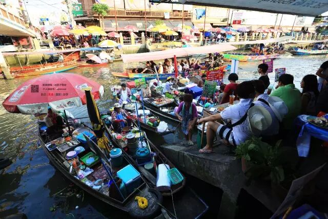 水上市场是泰国的一大特色,在电影《杜拉拉升职记》里炒热的泰国水乡,一幢幢古色古香的木雕风格泰屋围建在弯曲的河道上,木栈道靠水的一面停靠着一个又一个的小船,小船上是当地的居民边做特色小吃边叫卖。