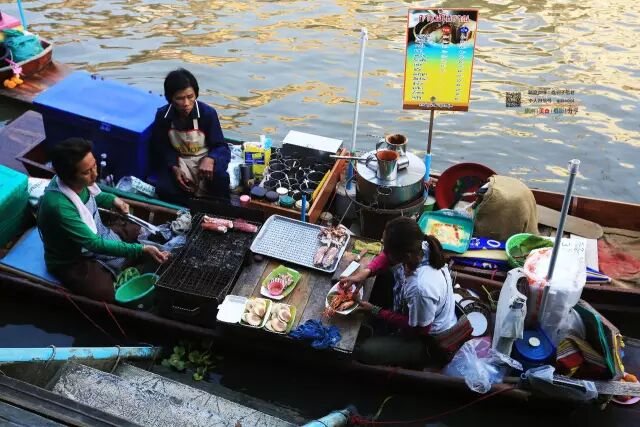 相比于早上热闹的丹嫩沙多水上集市,安葩洼水上市场则是午后比较繁荣,船上的小贩们在船只上装满了食物和饮料,如贻贝、面条、咖啡、泰南冰咖啡、糖果等,有的船上甚至支起了烧烤架,在船上做着各种美味佳肴。