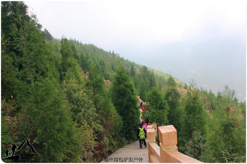 雪山上海拔一千米的木栈道,村庄和梯田的风光尽收眼底,远处的环绕高山和雨雾缭绕,近身是满山野的翠绿和寂静,