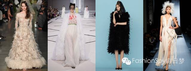 羽毛作为一种多变的材质,少量使用让人摇曳生姿,顿生轻盈的质感;而大面积使用则能营造出蓬松的大气华贵感,也是高级定制中所需要体现并与成衣有所区别的。有人就会问了,那一般人如何穿得出街?最近是年会季,很多朋友跑来问我说穿礼服走红毯或者主持该如何遮住麒麟臂顺便抗冻,其实羽毛质地的小外套和披肩是个不错的选择,只要有自信,走到哪儿都能亮出一道星光。