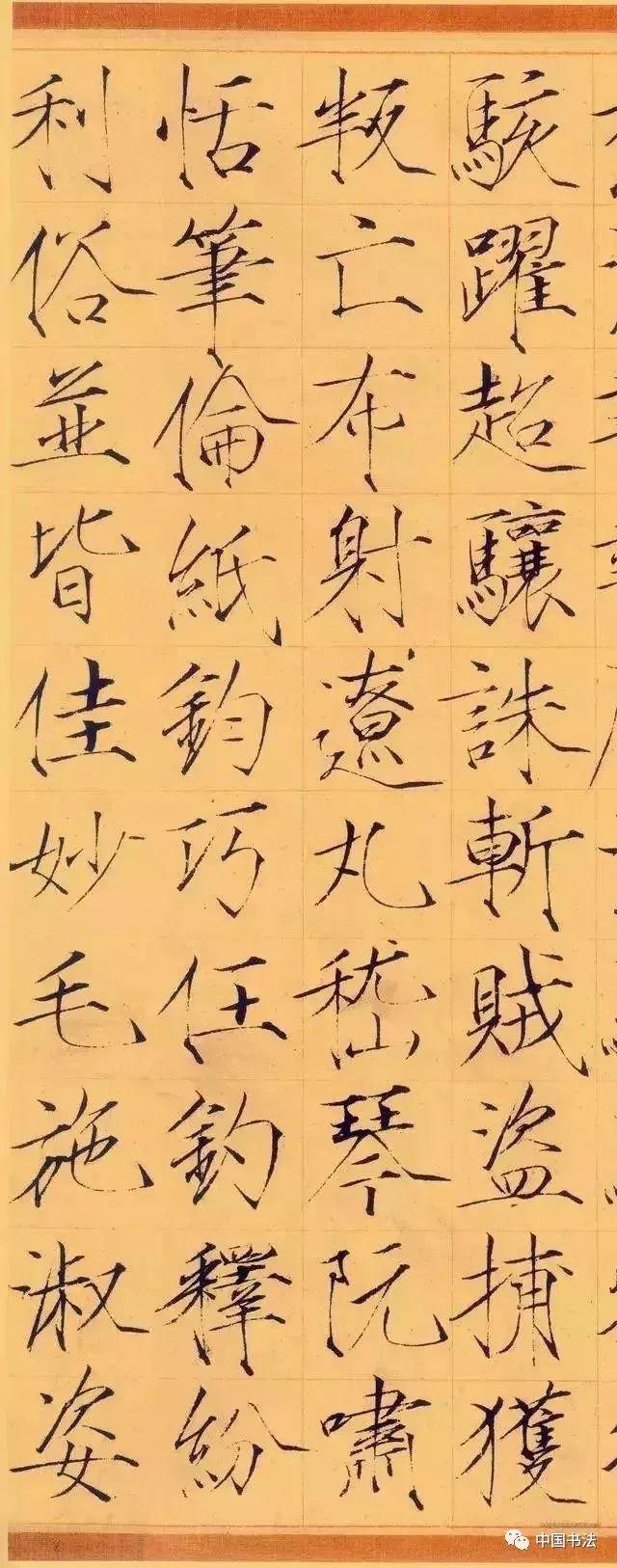 宋徽宗赵佶瘦金体书法千字文卷,为赵佶于崇宁三年二十二岁时书赐童贯的。其字大寸许,每行十字,前后百行。他真书学唐代薛曜,并且青出于蓝,间架开阔,笔划劲利,清逸润朗,别具一格。将“瘦金体”书法艺术推向极致。诚如当代著名书画鉴定家杨仁恺先生所云:“其结体疏朗端正,下笔尖而重,行笔细而劲,撇捺出笔锋而利,横坚收笔顿而钧,整体道丽瘦硬。”