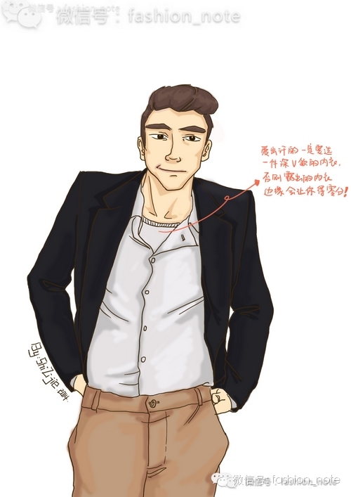 还有,一定记住,外套领口和衬衫领子之间的距离也不能过大,不然,嗯,这身衣服一看就是从叔叔那儿借来的吧。