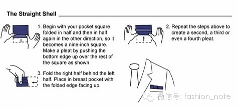 这是最简单的口袋巾折法,将口袋巾对折成适合西装胸部口袋宽度的方形,将边缘朝里塞入口袋,露出口袋水平直视1厘米左右为宜。这种折法适用于通勤,以较为容易折叠的棉布质地为好,且经典的白色为最佳。在稍微正式的场合或是商务西服上被广泛使用,不会给人留下故作姿态的印象,自然亲切。