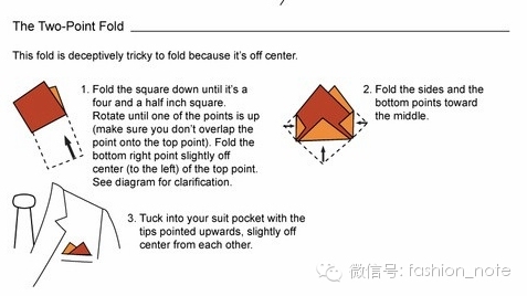 这种折叠方法适用于半正式场合,将方巾对折成三角形,然后将三角形错开成两个小山形,将不是山形的部分折到适当宽度,下半部向里折插入口袋中,让小山形突出可看到。