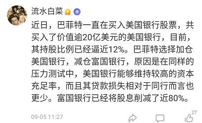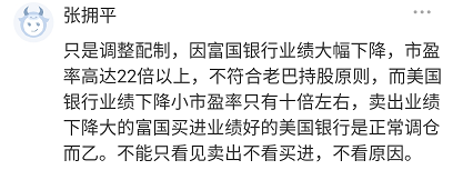 球友@张拥平也表示,这只是调整配制,因富国银行业绩大幅下降,市盈率高达22倍以上,不符合老巴持股原则,而美国银行业绩下降小市盈率只有十倍左右,卖出业绩下降大的富国买进业绩好的美国银行是正常调仓而乙。不能只看见卖出不看买进,不看原因。