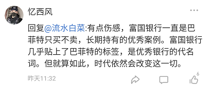 球友@忆西风表示:有点伤感,富国银行一直是巴菲特只买不卖,长期持有的优秀案例。富国银行几乎贴上了巴菲特的标签,是优秀银行的代名词。但就算如此,时代依然会改变这一切。