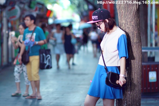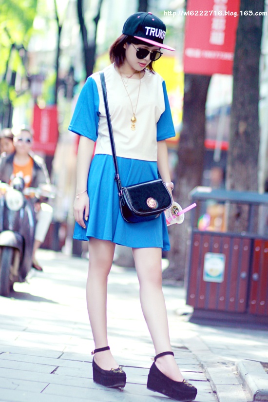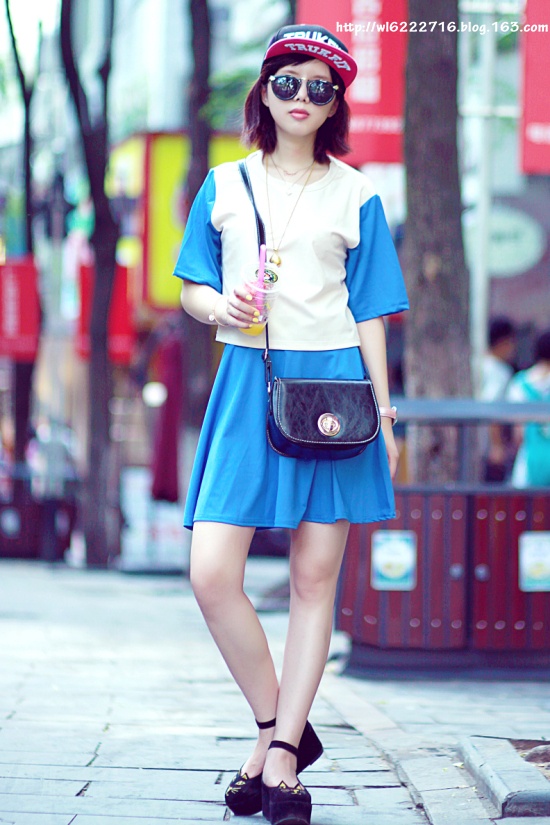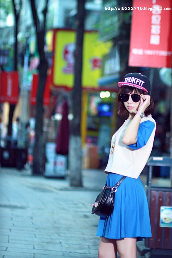 拼色的蓝色套装,搭配墨镜,和文艺小包。平檐帽 韩国复古街头风