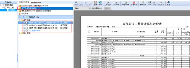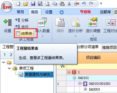 点结果表,可以生成、查看结果表(这个结果表不是实时刷新的,更改了数据后需要手动重新点下结果表)。多工程量的工程也可以直接分解到各个单位工程中去,点击分解按钮即可。