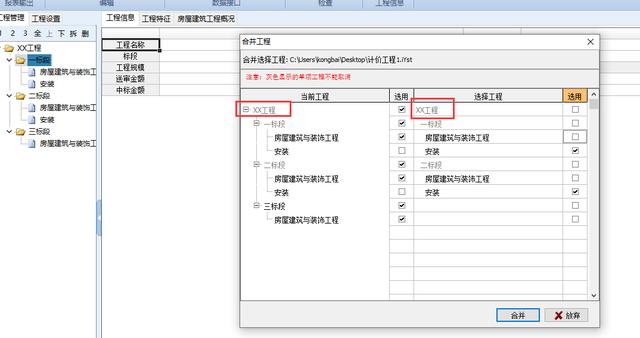 首先必须保证两个工程的工程总项目名称是一样的,然后随便打开一个工程,点右键合并其他工程,勾选需要合并的单位工程,合并即可。