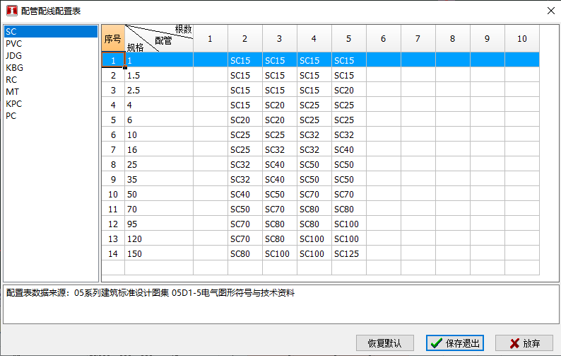 配管配线表:该表是按照标准设计图集相应规范对各种材质电线管中各规格、根数的电线穿管管径表格。若设计不满足本规范,工程量计算完成后可通过本规范进行配管管径的重新配置及生成,如下图: