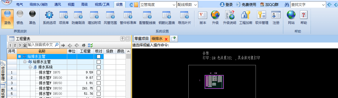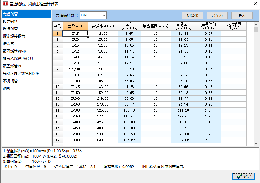 防腐刷油:设置各种材质管道的管径信息后,计算管道附属的防腐刷油、保温、支架等工程量时取值来源于此,如下图: