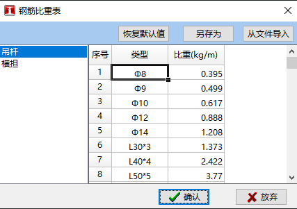 钢筋比重表:计算管道支架时需用到圆钢、角钢等钢材规格及比重的选择,该表是集中维护相应规格及型号,如下图: