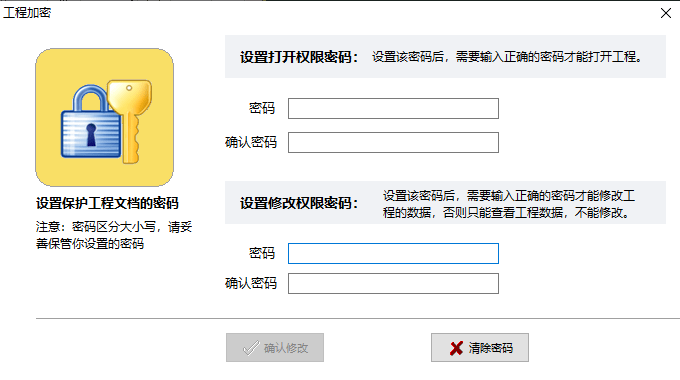 工程加密:可对工程文件进行加密设置,加密设置为打开权限加密与修改权限机密,若设置了工程机密请妥善保管加密口令,如下图: