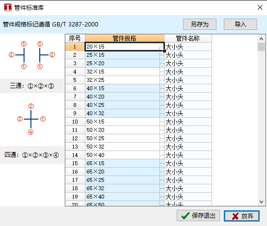 标准管件库:给排水、喷淋、消火栓专业计算的管件原则为该标准管件库中有的直接处理,标准管件库中无时按照由大到小加转接的方式自动优化计算管件工程量,该标准管件库可根据工程实际情况和各地区实际管件生成规格进行维护,以便管件工程量的计算更为精确,如下图: