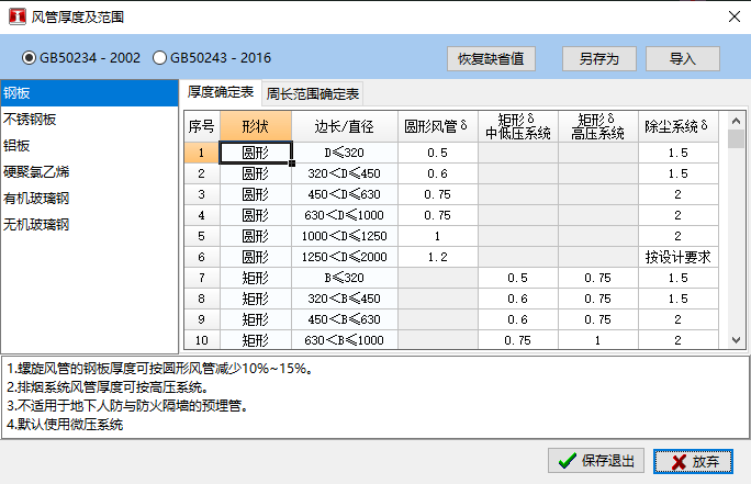 风管范围:该选项设置是将不同材质、不同风压等级的通风管道,通过材质、风压等级、大边长或直径自动确认风管厚度的设置,软件中内置相应规范的参数设置,用户也可根据实际工程情况对起进行厚度的调整,如下图: