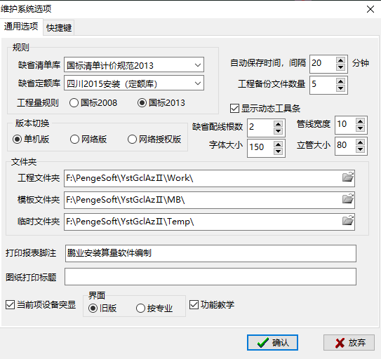 系统选项:对缺省的清单、定额库设置、自动保存时间与工程备份数量设置、工程量规则设置、软件版本(单机版、网络版、网络授权版)设置、确认配线根数设置、字体大小及管线宽度及立管大小设置、工程文件模板文件及临时文件保存路径、快捷键等设置,如下图: