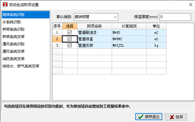 增加附项:各专业系统通过模型方式计算工程量时,计算的管道项目所附属的刷油、保温、支架是否需要生成的集中设置,如下图:
