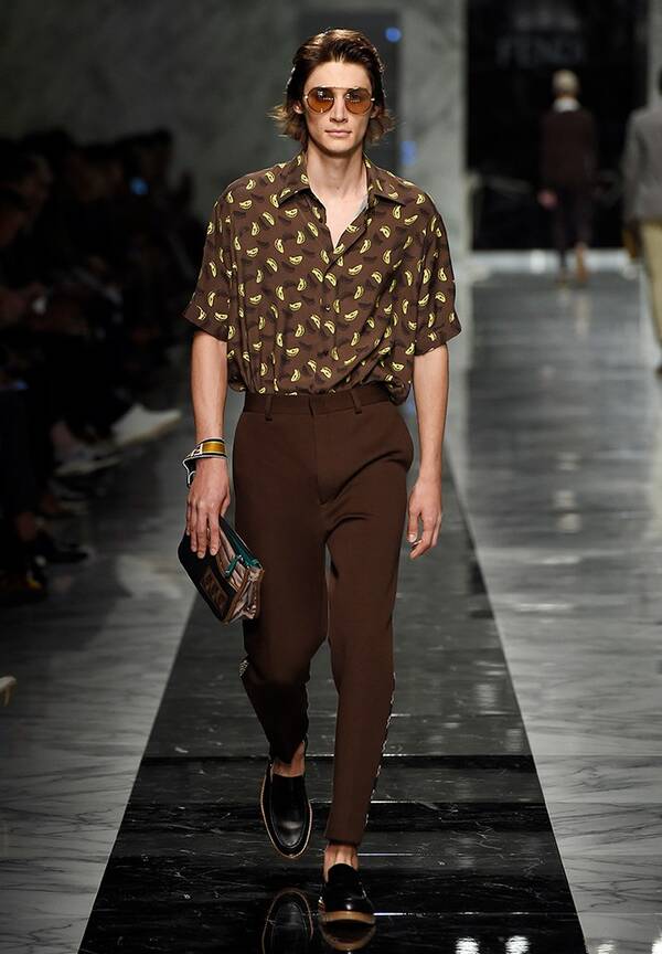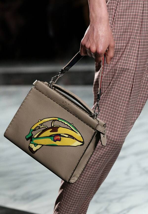 记忆深刻的是米色、棕色和灰色三款,米色缀以EVERYDAY FENDI BANANA镶饰,设计主题以富有艺术感的方式重新演绎日常用品。
