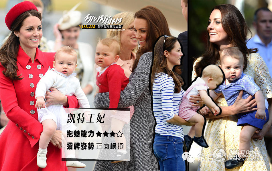 虽然不为街拍,但其实凯特王妃也是抱娃的个中好手。或许是被封为“表情帝”的儿子乔治王子各种鬼脸实在太过抢镜,让大家忽略了凯特抱孩子的姿势其实也是十分特别而有趣的。从下飞机到去球场,小乔治从来都是双腿朝前,被王妃妈妈当做展示品一样的横抱在胸前,莫非凯特自己也迫不及待地向大家展示小王子的百变表情?小王子你表情那么扭曲,是不是觉得这种姿势没有安全感太没有安全感啦?