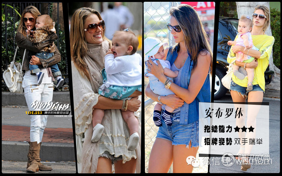 维秘超模亚历山大-安布罗休(Alessandra Ambrosio)如今已经是一儿一女两个孩子的妈妈,平时街拍也是怀中孩子一直少不了,抱完女儿抱儿子。但是与李小璐形成对比的是,作为身材高挑的狂野巴西美女,照理说应该不少力气,但是安布罗休抱孩子的姿势却常遭吐槽,这种双手端举,把孩子放在身体正面的姿势,怀中宝宝看上去并不太舒服呢,不过看在安全性有保障的面子上,这分还是略微打高一点吧!