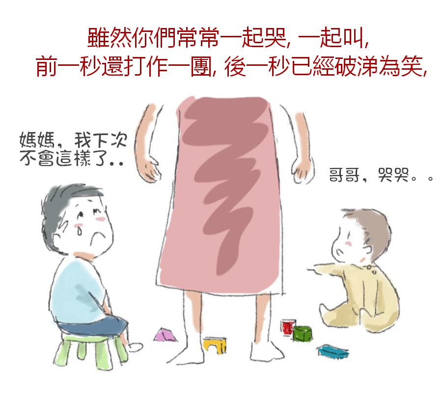 轉眼4年過去了,我也成為了兩個男孩的媽媽,自己在家照顧兩個小小孩,常常被人問起,你怎麼會想生兩個的?其實每天面對兩個打打鬧鬧的娃兒,當他們一起生病,一起吵著要我陪睡,一個哭一個鬧的時候,我也常常自問,為什麼要兩個呢?