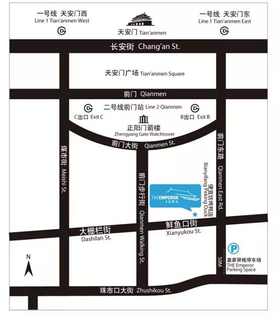 地铁二号线B、C出口,经前门大街、前门步行街转向鲜鱼口街,到达酒店,约600米。