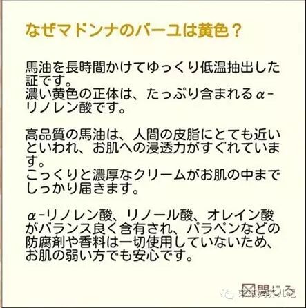 黄色恰恰证明Madonna马油是经过长时间、低温萃取出去出来的产物,金黄色的膏体富含α-亚麻酸。高品质的马油与人体的油脂非常接近,所以渗透力异常优秀,马油看上去虽然油油腻腻浓浓厚厚的,但很快就能吸收到皮肤中去。马油含有α-亚麻酸、亚油酸、油酸等丰富的营养成分,防腐剂和香料神马的一概没有,所以再敏感的肌肤都可以安心使用。