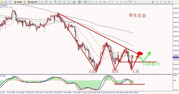 金评:今日金价开盘1564美元,昨日金价自亚盘1556下跌至1533后下方买盘强劲,形成V型反弹走势,整体日内行情震幅比较大,跟我们金评操作的朋友应该数钱数到手抽筋。晚间最高触及1570后高位横盘整理,日线上看,昨日金价开盘下行,延续前日弱势走势,最低触及1532附近,晚间于此得到支撑后出现强势反弹,完全收复日内失地,形成底部V型反转,并使得日线收取一根带30美金引线的小阳线,那么日内继续延续昨日晚间反弹走势可能性就比较大了。而从近期走势来看,连续三次下探1530-1540这一支撑带,均出现快速拉升,表明这一线支撑非常强劲,同时我们从K线上看,三次回踩1530附近得到支撑后出现拉升,形成一个比较好的三重底格局,目前颈部看1582-1580一线,近期若能突破此压力,那么上方空间放大至这一形态高的空间,也就是1620附近。4小时线看,前面收取一根带长下引线的小阴,随后紧跟一根大阳上行,构成一个比较好的底部走势,但当前并未突破布林中轨1568一线压制,当前于此承压出现一定的回落,但从附图指标来看,MACD勾头有形成金叉迹象,若金叉形成,将给多头带来进一步上行空间,那么日内继续关注1568-1570一线的破位情况。综合来看,昨日金价再次下探近期低点,并于此得到支撑后出现强势反弹,再次探底成功,目前上行受阻,短期有回落蓄能需求,而当前金价呈现多头反弹走势,那么等待回落以后做多是一个比较好的选择,上方关注昨日高点1570一线能否成功突破,从而延续多头反弹格局,上方关键压力还是本周高点1582一线。目前1560形成支撑,可在此位做多,止损4美金,目标看至1568—1570,突破继续持有,具体建议李生将在博客即时直播!