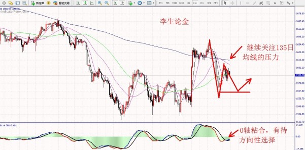 金评:今日金价开盘1596美元,昨天金价走势与我们金评中分析的完全一致,早盘跳空高开并没有带动多头买盘更进,而是进行了回补跳空的缺口,美盘最低触及日线布林带中轨1582美元,一度以高开走势引爆本周市场的金价昨天还是草草了事,昨天早盘的跳空也仅仅是昙花一现,整日维持一个慢跌形态。日线的跳空高开可谓给予多头无限信心,但昨天博客中我们就讲到,日内需回补缺口,方向先跌后涨,可能很多看多的投资者可惜好景不长,昙花一现,在最低下探1582之后,整日跌幅达到了25美金之多,即时尾盘奋力反弹也无济于事,最终日线一根光头大阴赫然醒目,目前从形态来看,价格维持在BOLL中轨之上运行,这对于多头无疑是一个较强支撑,但收盘于短期均线5日向下死叉10日均线的之下关键位置,多头有一种有力使不出来的感觉,加上30均线又向上勾头,在日线的均线系统之上我们看到的是一个区间震荡的格局,预计在短期之内这种震荡修复还将继续,大区间的整理时间周期可能延续到本周结束,其附图指标MACD在低位金叉也出现缩量,如不能有效突破0轴继续放量,这种震荡走势恐将演变成为不断下探支撑,短期内上方关注1600和1620,下方则是1580一线的中轨支撑;从4小时图来看,目前金价一直运行在布林带中轨下方,日内还将有再次探底的需求,MACD在0轴下方粘合,1小时重点关注上方半年线位置1606美元压力,日内只要没有突破此位,主要以逢高做空为主。但大的区间不过分看空,以1623—1560本周区间震荡对待。具体建议李生将在博中即时直播!