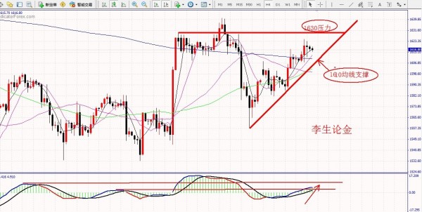 金评:今日金价开盘1618美元,昨天金价亚欧盘一直横盘整理,美盘强势拉升至1624,在日线66日均线处理受阻,目前稍作回调后继续高位横盘整理,从日线图看,v字型反转依然运行良好,下一目标1628,而上方60日均线在1622呈现较强阻力。而对于后期的走势,需要观察本次上扬会不会形成顶部背离形态。下方支撑继续关注10日均线1610。从四小时看,昨日上方多次试探1624,下方回踩1612得到支撑,总体陷入盘整,预计盘整后还将会有一波突破上行。但总体看,四小时指标暂时偏高,随时有可能出现一波获利回吐。综合来看,昨日亚盘回踩1607得到支撑后,美盘冲高回落,预计今日亚欧盘回踩得到支撑后还将呈现会有冲高,上方重点关注1628位置。4小时图布林带上行趋势得到确认,将有进一步的上升空间,基本亚盘无力,或在上轨附近盘整。小时图布林带正在缩口,MACD死叉形成,后市或仍有小幅下跌空间